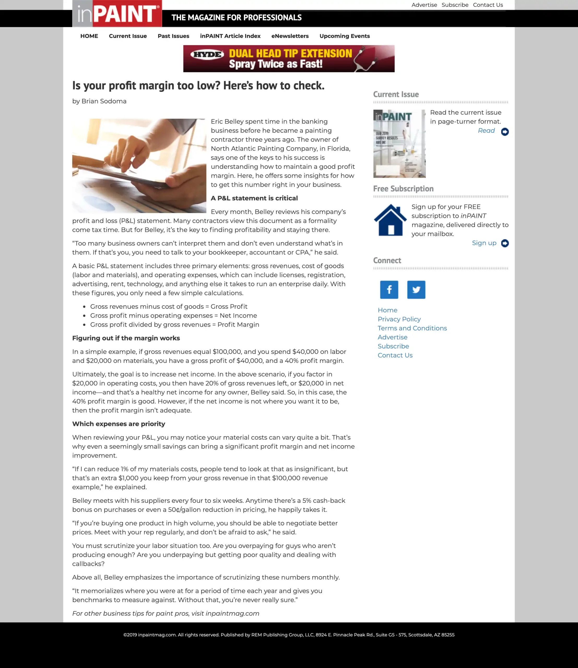 Check out this recent article inPaint’s Brian Sodoma wrote about our very own Eric Belley. The original article can be found at http://inpaintmag.com/is-your-profit-margin-too-low-heres-how-to-check/.